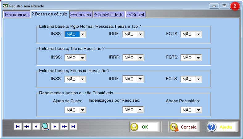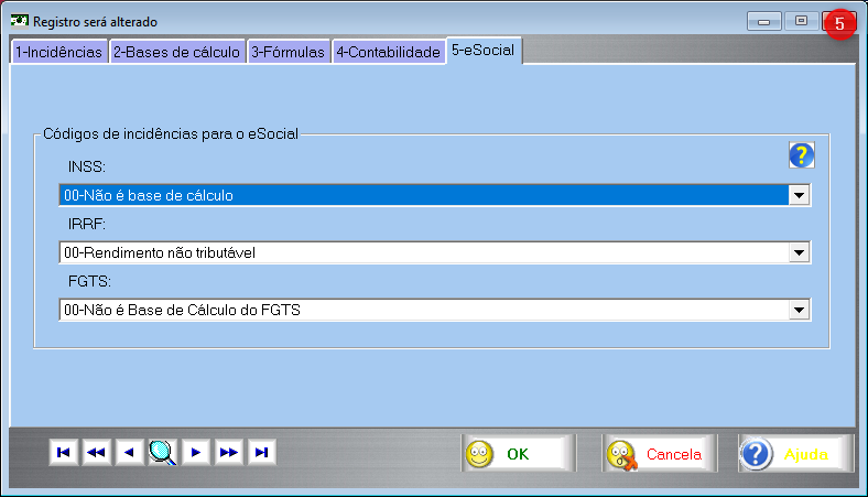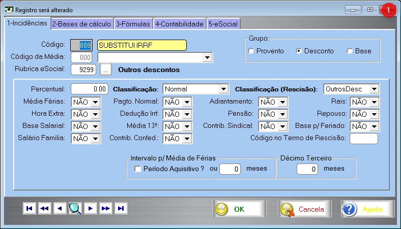 O evento S-1200 envia os rendimentos auferidos pelo trabalhador, mas não pode enviar a pensão nem o IRRF. Esses dois descontos devem ser enviado pelo S-1210. Ocorre que ao enviar o evento S-1200 sem esses 2 descontos o líquido guardado pelo esocial fica incorreto. Quando se vai enviar o S-1210, aí sim, já com a pensão e o IRRF, também se deve enviar o líquido discriminado, que irá considerar esses 2 descontos, o que vai resultar em resposta de erro do sistema do esocial avisando que o líquido calculado pelo envio do S-1200 (sem o IRRF e a pensão) não corresponde ao líquido discriminado no S-1210 (com o IRRF e a pensão). A diferença será justamente o IRRF ou a pensão. Para suplantar esse problema, 2 verbas de desconto substitutas devem ser criadas para que ao enviar o S-1200 substituam o IRRF e a pensão, que como já foi dito, não podem ser enviados nesse evento. O intuito dessas verbas é permitir que o esocial calcule um líquido correto, o que impediria o erro acima apontado quando do envio do evento S-1210. Para criar essas verbas 888 e 889 basta seguir as imagens abaixo: